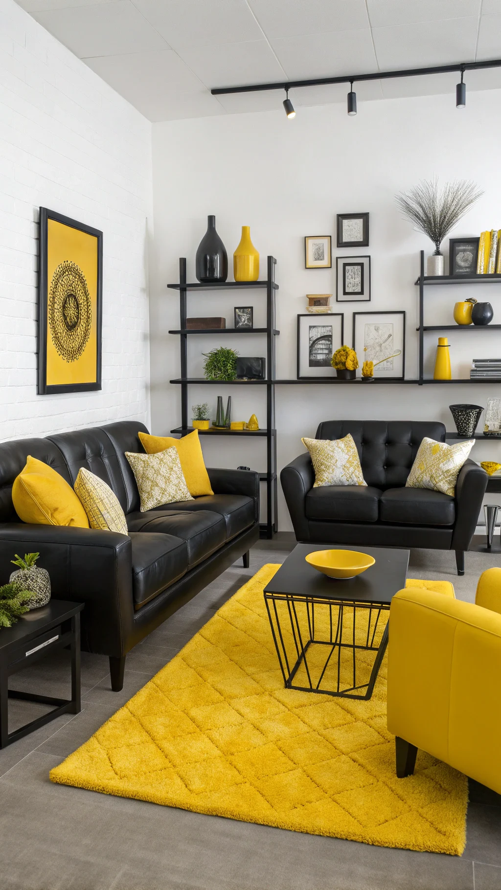 Feeling hesitant about committing to such a bold palette? Start with small touches like yellow cushions on a black sofa or black-and-white artwork framed in yellow. If you’re ready to be bolder, consider painting an accent wall in a warm yellow tone-just avoid overly neon shades to keep it sophisticated. Small changes can make a huge difference without overwhelming your space.