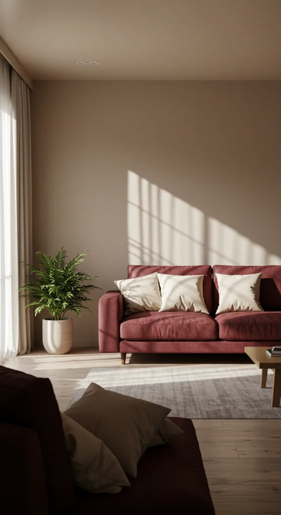 The rich, luxurious tone of burgundy paired with soft sand hues creates an elegant yet cozy setting. This duo works beautifully in spaces with ample natural light, enhancing the room’s warmth and sophistication while maintaining a welcoming feel.