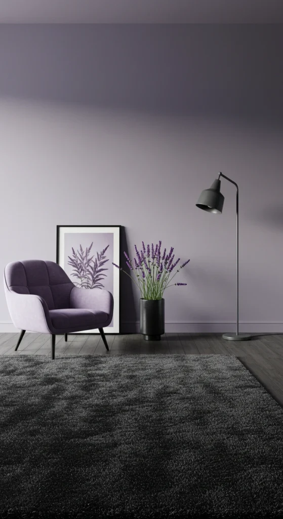 The gentle hues of lavender combined with the depth of slate grey create a tranquil yet refined atmosphere. Lavender’s calming influence softens the boldness of grey, resulting in a balanced space that feels both restful and stylish.