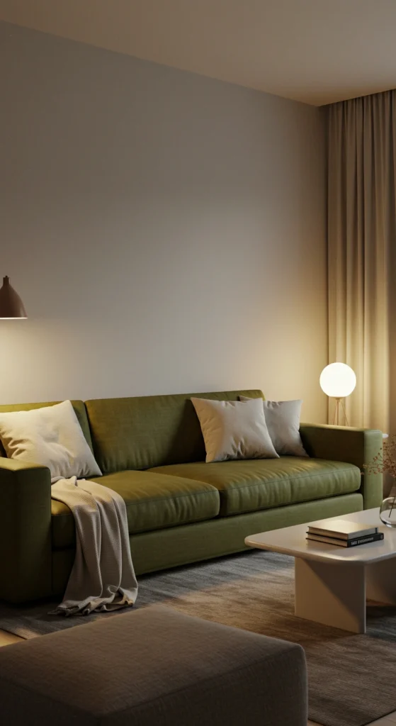 Bringing the outdoors inside, olive green paired with soft ivory creates a peaceful and grounded living space. This combination evokes a sense of nature’s tranquility, making it ideal for those who want a soothing retreat within their home.