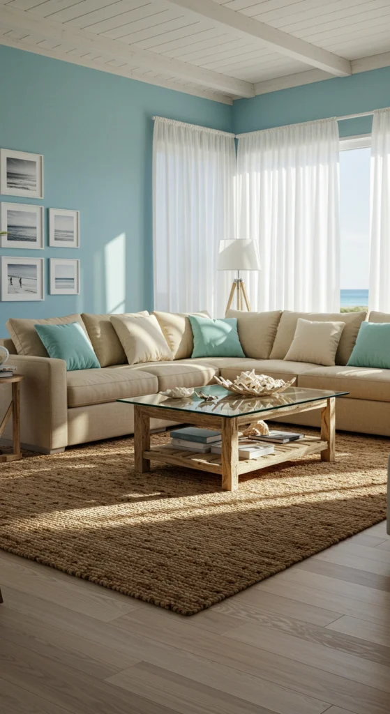 Evoking the tranquility of the seaside, sky blue walls paired with warm beige furnishings create a light, airy, and welcoming space. This combination is perfect for those who want to bring a refreshing coastal vibe into their home.