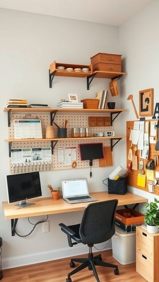 Utilizing your walls effectively can dramatically declutter your workspace and enhance accessibility. The featured setup demonstrates how wall-mounted shelves and pegboards can turn vertical surfaces into valuable storage zones. Decorative containers on upper shelves conceal supplies neatly, while the pegboard below offers a practical spot for frequently used tools and reminders.