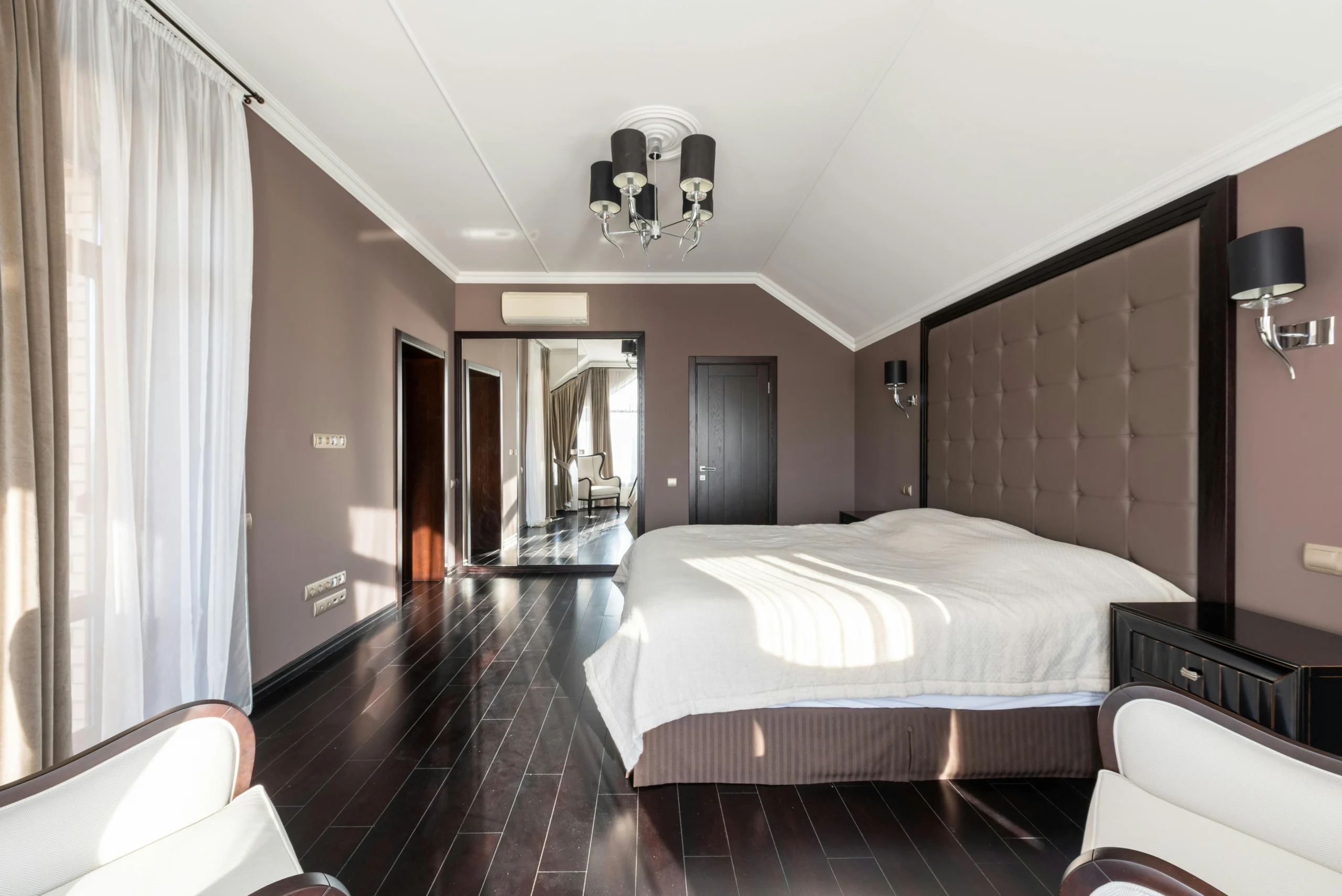 Dark tones don’t have to feel heavy. This bedroom balances charcoal bedding with bright white walls and ceilings, creating a cozy yet airy environment. Sheer curtains soften incoming light, while mirrored closet doors amplify brightness and spatial perception.