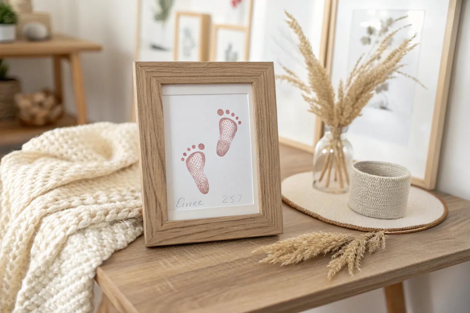 - Wooden Baby Footprint Display Frame: Showcase your baby’s tiny feet in a beautifully crafted wooden frame for a timeless keepsake.