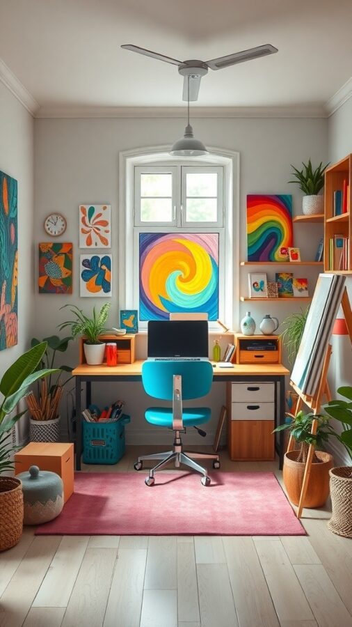 A colorful artistic studio featuring a desk with a computer, vibrant wall art, plants, and a cozy rug.