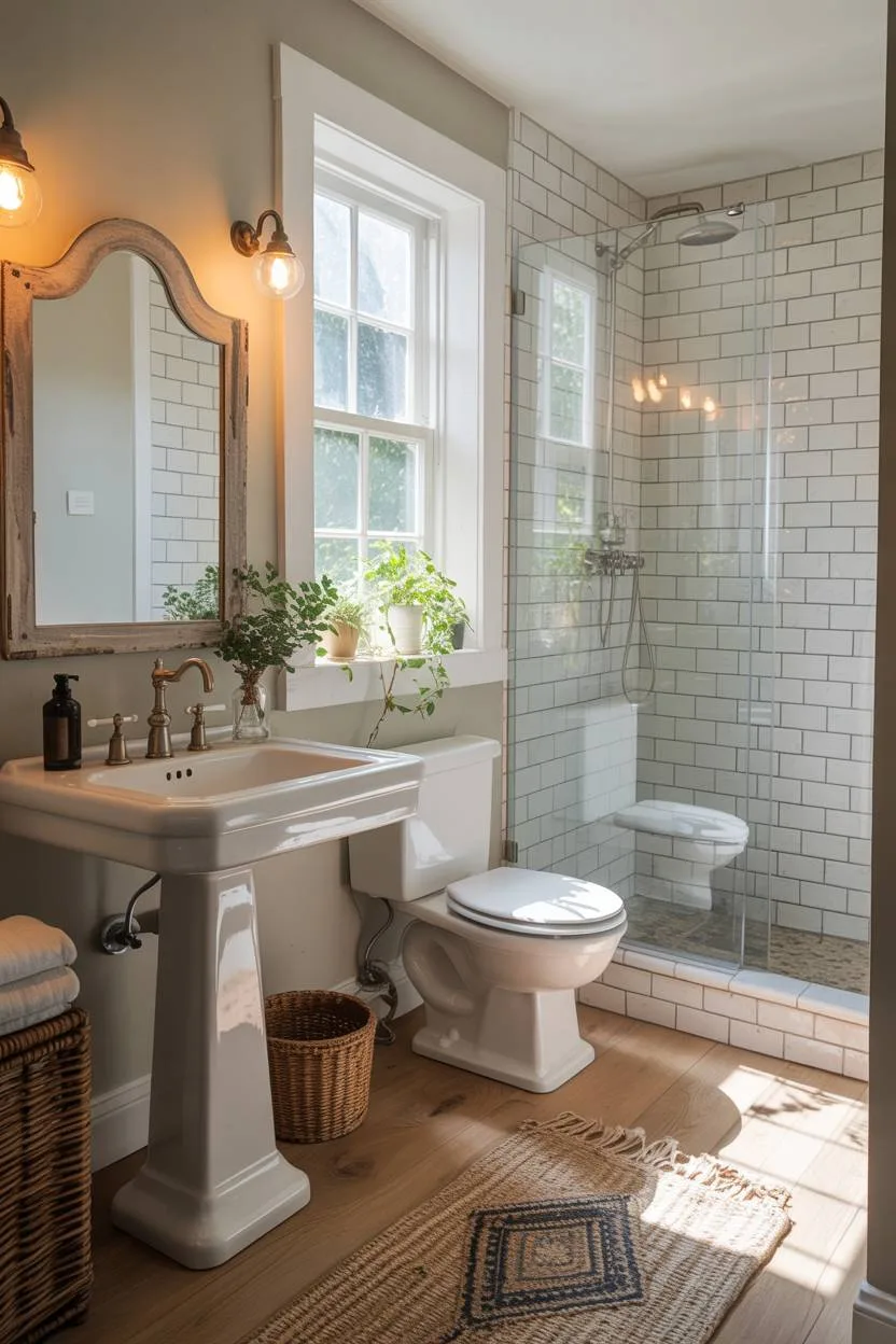 Whether your preference leans toward weathered wood, vintage fixtures, or modern farmhouse twists, this style adapts seamlessly to any bathroom size.