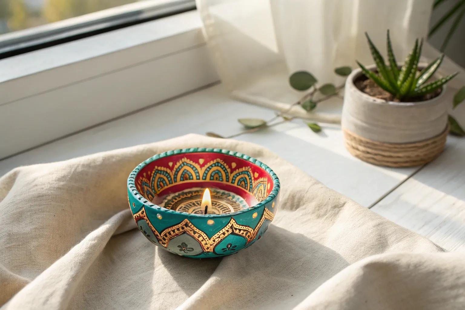 Explore the art of mandala painting to add intricate, meditative designs to your diyas. This technique not only beautifies but also offers a calming creative experience.