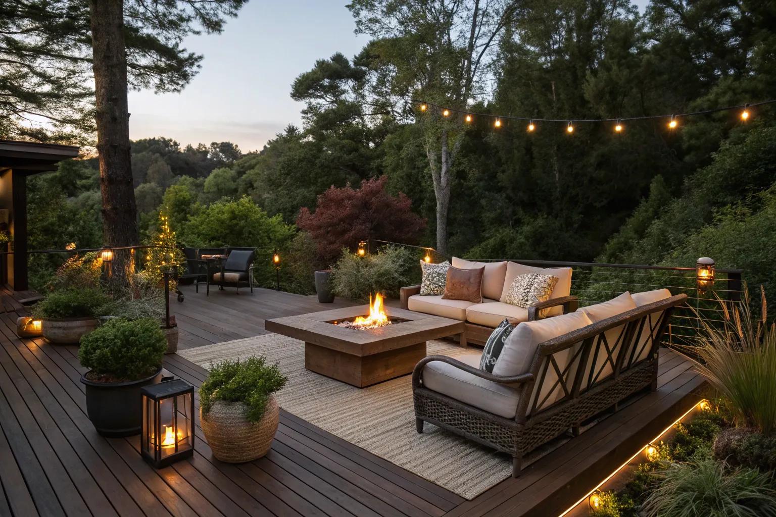 Fire pit table creating a cozy focal point on the deck.