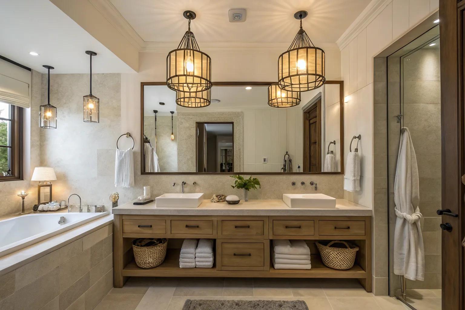 Introduce a touch of glamour with crystal light fixtures above your mirror. These lights create a dazzling effect that elevates the bathroom’s ambiance without overwhelming the space.