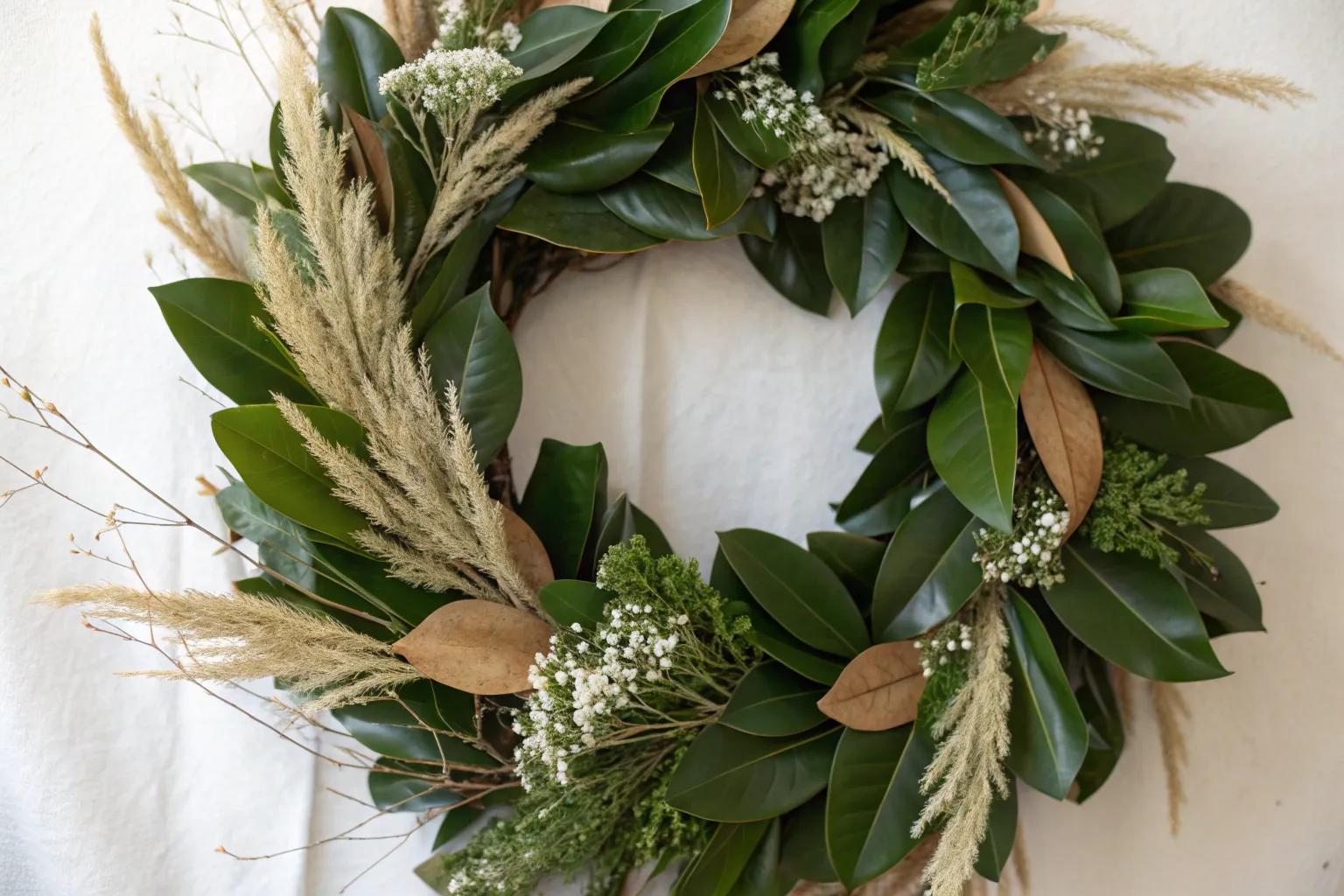 Mix magnolia leaves with eucalyptus sprigs to create a visually appealing wreath that also fills your home with a calming fragrance. This combination is a favorite in contemporary spring wreath designs.