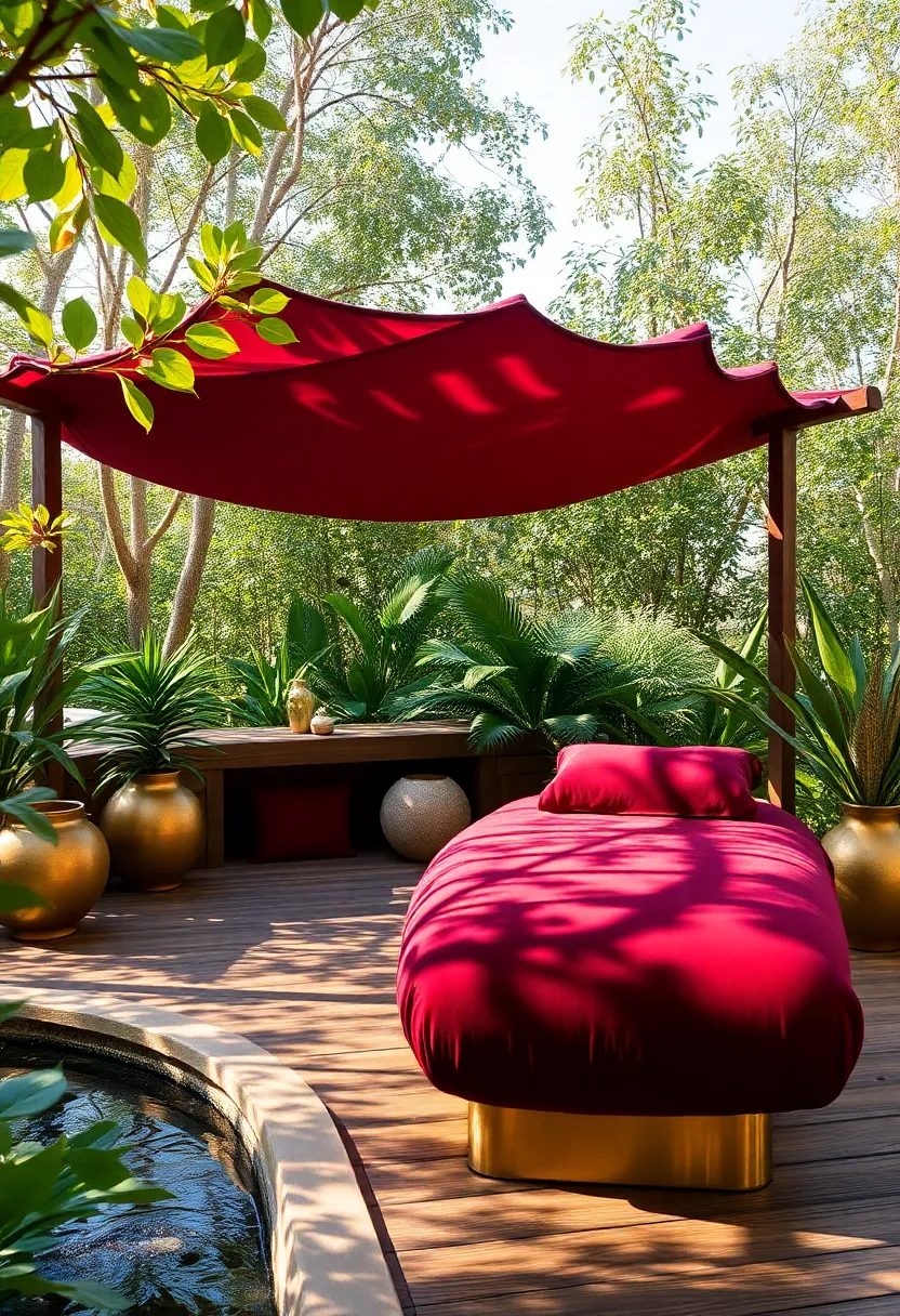 The ambiance is designed to pamper your senses and elevate your emotional well-being. With nature-inspired elements, this spa area boasts comfortable seating and tranquil water features that complement the striking color scheme of deep burgundy and gleaming brass. Each element, from the chic lounge chairs to the elegantly crafted massage tools, serves to create a lavish oasis that beckons you to take a moment for yourself. Below are some features that make this outdoor spa sanctuary a must-visit: