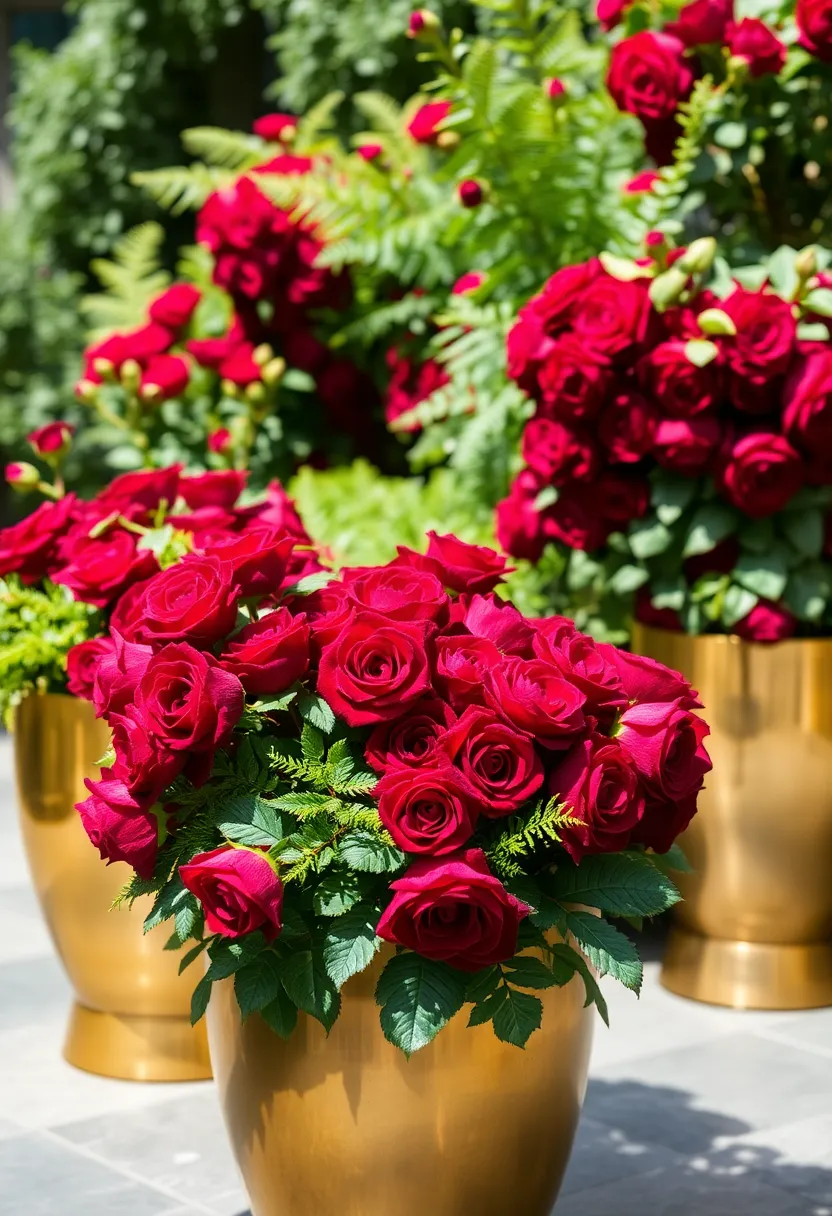 Imagine stepping into an opulent garden oasis where the air is perfumed with the intoxicating scent of deep burgundy roses. These majestic blooms are more than just lovely; they are the crown jewels of this luxurious outdoor space, each petal a velvet touch that beckons you closer. The roses are thoughtfully arranged, interspersed with plush ferns and delicate green foliage, creating a rich tapestry of color and texture. To accentuate this floral extravagance, the garden is dotted with elegant brass planters that catch the sunlight, their gleaming finish mirroring the elegance of the surroundings. The brass not only adds warmth but also a touch of sophistication, creating a harmonious blend that envelops visitors in a serene and regal atmosphere.