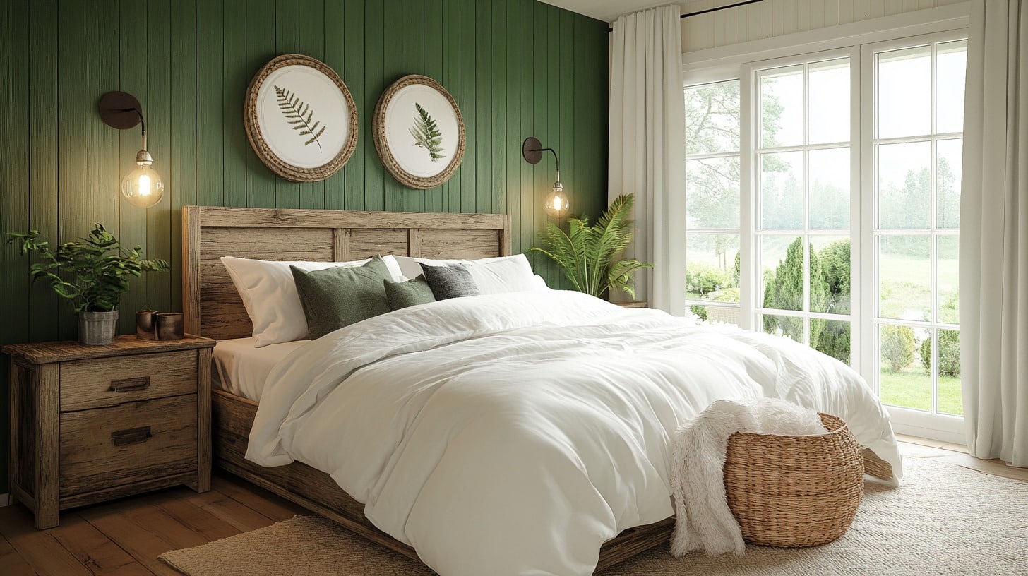 Immerse yourself in the calmness of a forest-inspired bedroom featuring rich green walls paired with natural wood furnishings and earthy accents. This harmonious blend evokes a peaceful ambiance, connecting you with nature while remaining budget-conscious.