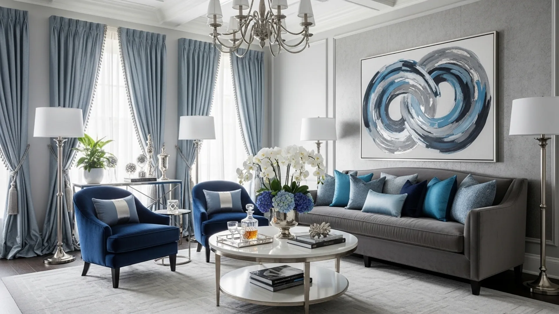 Incorporate navy and silver décor elements to infuse your grey and blue living room with a touch of glamour. Use navy cushions, silver candleholders, and a grey rug to balance the metallic shine with deep hues. This luxe look was a standout in a client’s home makeover, offering a sophisticated and chic atmosphere. Use metallic accents sparingly to avoid overwhelming the space.