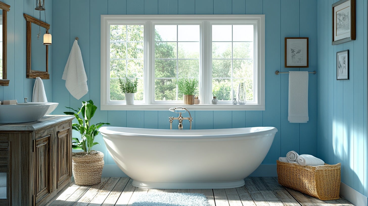 Utilize soft sky-blue tones to create an open, airy bathroom that feels spacious and welcoming. Pair pale blue walls with natural wood elements and white accents to enhance light reflection, making this scheme ideal for compact bathrooms seeking a brighter atmosphere.