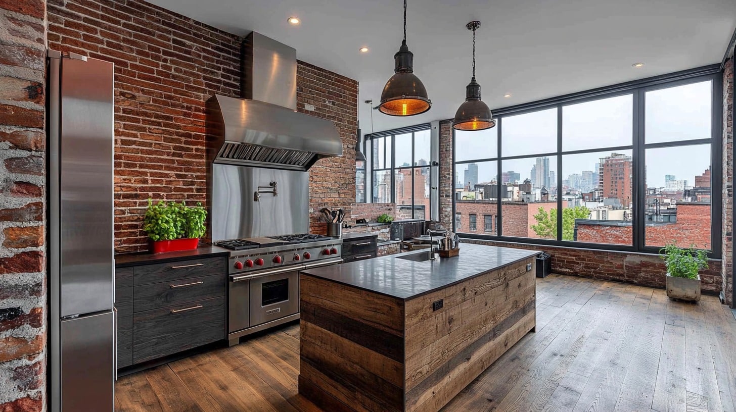 Combine the raw appeal of industrial design with contemporary sophistication by featuring exposed brick, metal fixtures, and sleek appliances. To counterbalance the rugged materials, add boho-inspired window coverings that introduce softness and a relaxed vibe, transforming the space into a welcoming urban retreat.