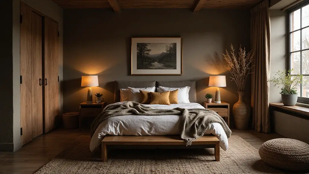 For a dark earthy bedroom, prioritize materials that add warmth and texture. Rich wooden furniture like walnut or mahogany sets a natural tone. Incorporate earthy textiles such as organic cotton, linen, or wool in deep hues. Adding natural stone features and handmade ceramics enhances the organic ambiance.