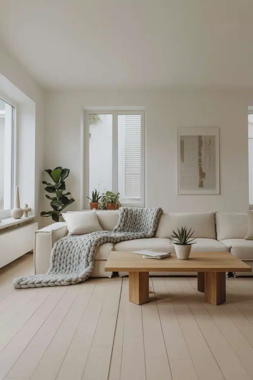 Minimalist Scandinavian living room with cream sofa, chunky knit throws, and natural oak furniture