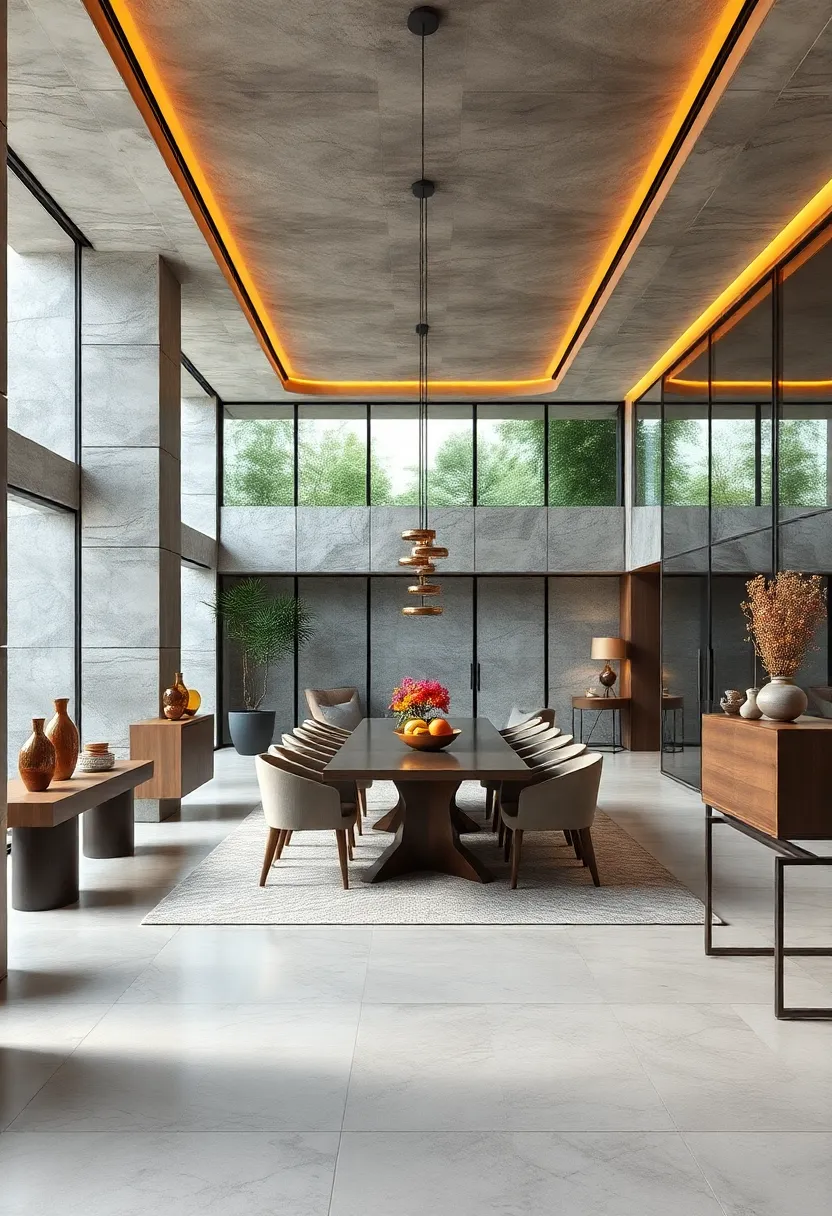 Embodying the essence of modern refinement, this dining space harnesses the power of seamless floor-to-ceiling glass walls to dissolve boundaries between indoors and out. Natural light floods the room, illuminating a carefully curated ensemble of understated furnishings—think sleek, lacquered tables paired with minimalist, sculptural chairs. The subtle neutral palette, anchored by soft greys and warm whites, instills a sense of calm, allowing the architecture itself to shine as the main attraction.