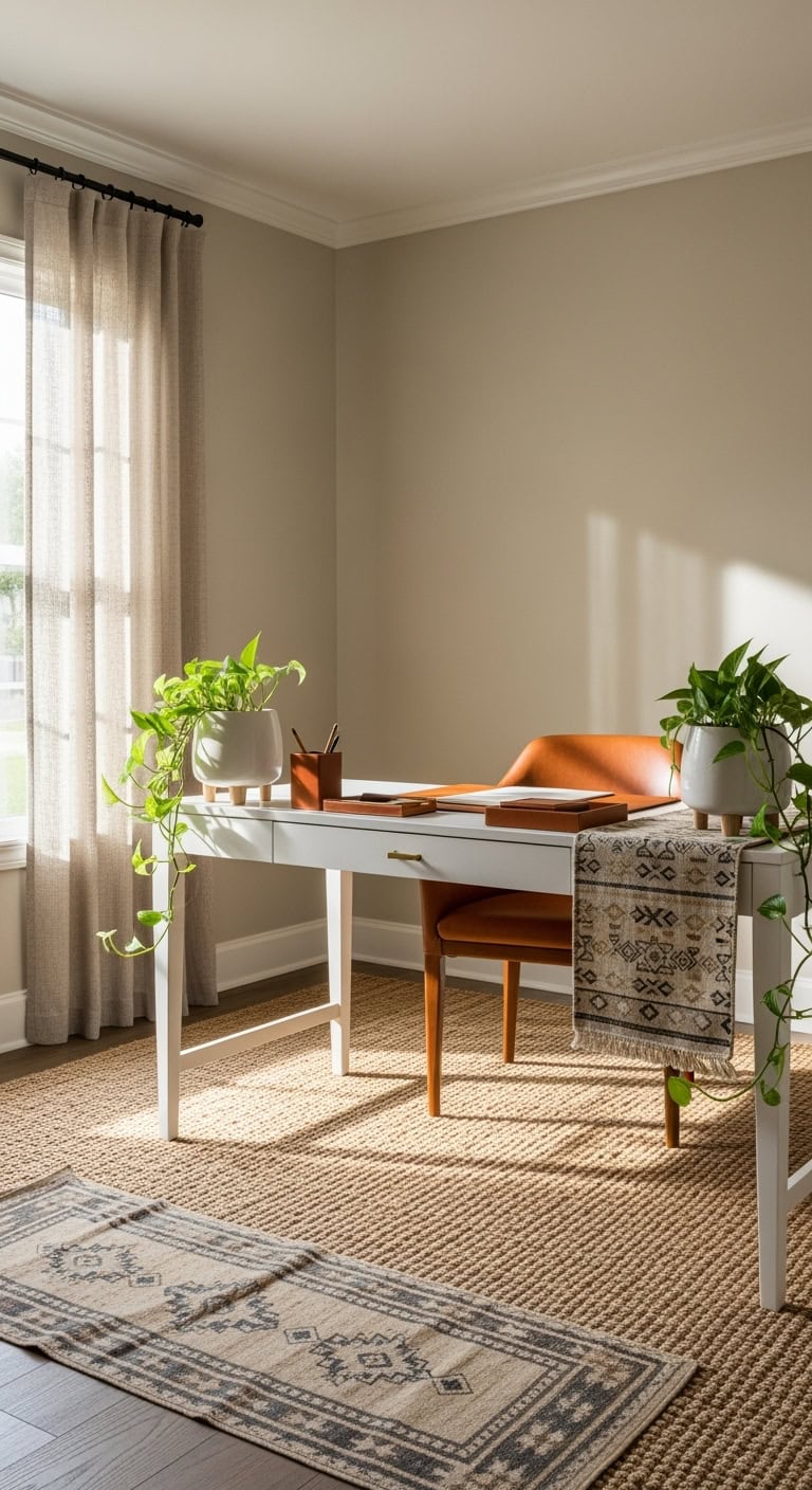 A woven macramé wall hanging sets a textured backdrop for this cozy office. A chunky taupe knit throw drapes over a vintage leather chair, while layered jute and wool rugs create a warm foundation. Terracotta planters with trailing pothos add a lively touch to the neutral palette.