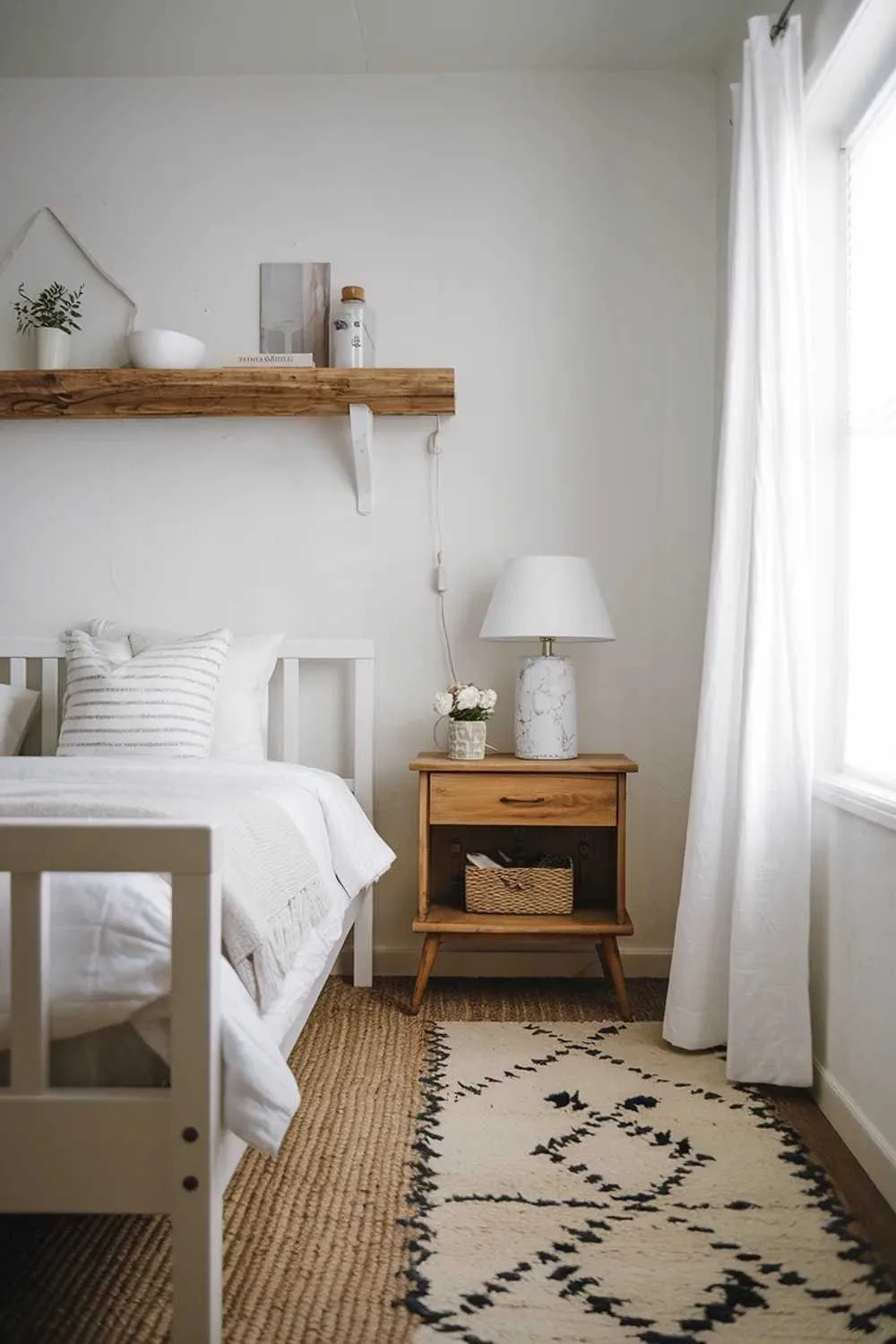 Scandinavian farmhouse bedroom with wooden platform bed, white headboard, rustic nightstand, and woven rug.