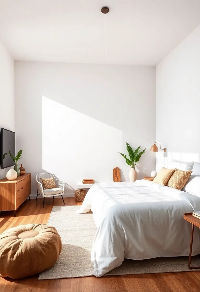 | Soft beige, light taupe, pale pink | Linen, cotton, distressed wood | Wooden nightstands, woven rugs, brass lamps |