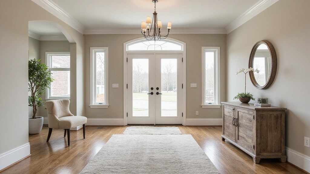 Transitional design merges traditional and modern aesthetics to create a balanced, timeless look. In a mid-size entryway, this involves pairing medium wood flooring with warm beige tones, incorporating functional yet stylish furniture, and using lighting and accessories that complement both classic and contemporary elements.