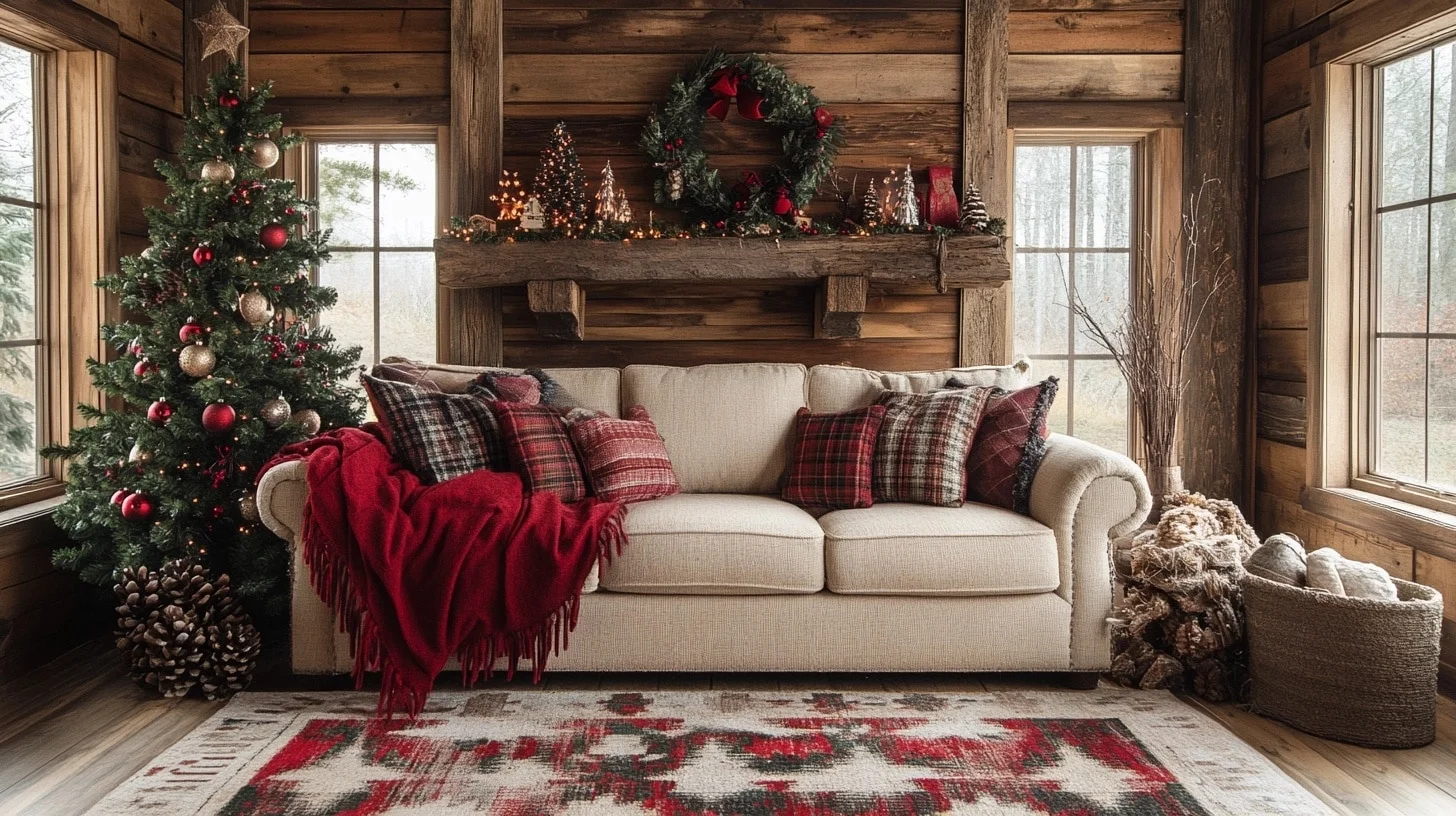 Cozy Plaid Cabin style envelops your space in warmth with plaid ribbons, plush ornaments, and amber string lights. The rich palette of deep reds, forest greens, and soft neutrals evokes the comfort of a mountain lodge, enhanced by layered textures like faux fur and wood accents.