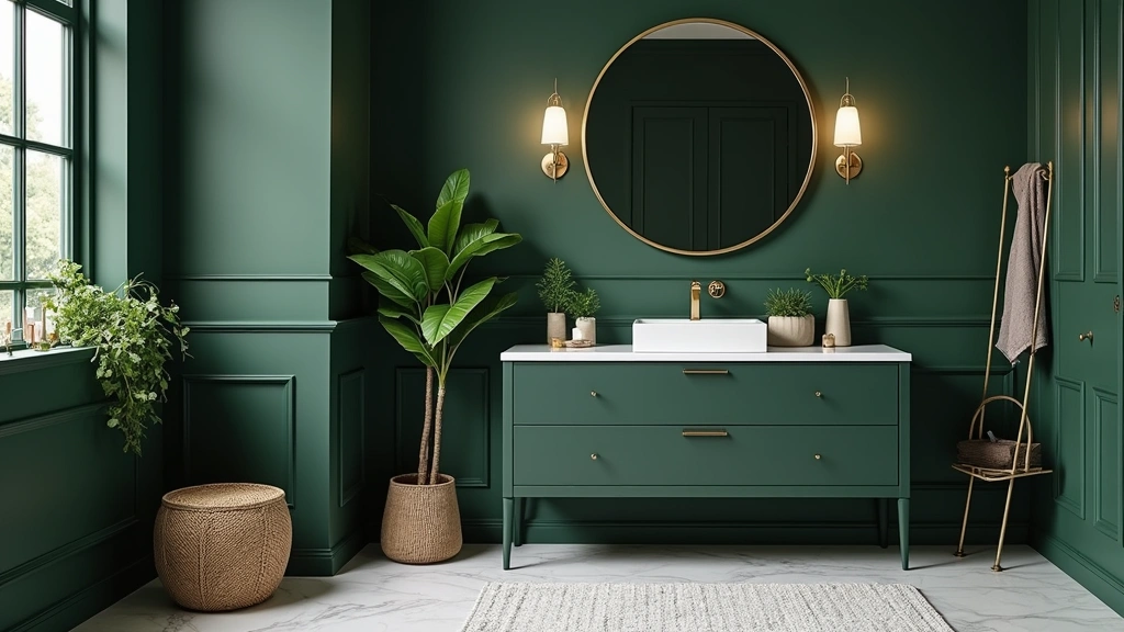Transform your bathroom into a peaceful woodland retreat with deep forest green walls and a rustic wooden vanity. The natural textures bring warmth and sophistication, perfectly complementing the verdant hues.