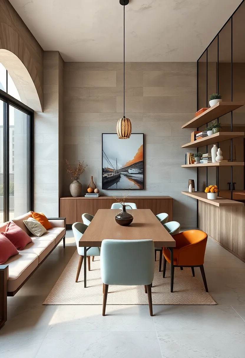 Elevate your dining room ambiance by pairing sleek floating shelves with a daring wallpaper accent wall. The bold patterns and rich colors create a dramatic contrast against the clean lines of the shelves, turning this duo into an eye-catching focal point. Use the shelves to display a curated selection of vibrant art pieces, from abstract canvases to sculptural ceramics, adding depth and personality without overwhelming the space. The interplay of textures and shapes against the vivid backdrop brings a gallery-like vibe, perfect for those seeking a modern yet lively aesthetic.