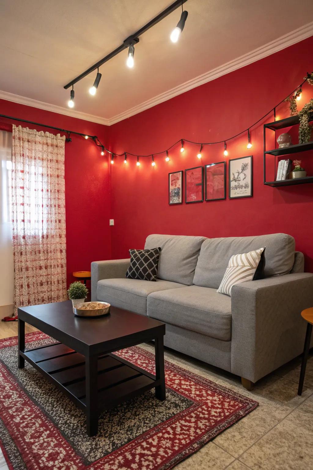 Incorporate red lighting elements such as pendant lamps or floor lamps to create a cozy glow that enhances your living room’s palette. This subtle infusion of red light adds warmth without overwhelming the space.