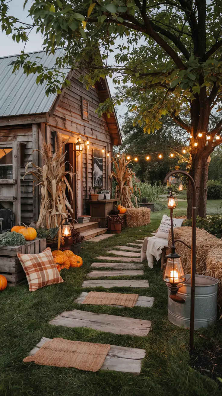 Transform your yard into a welcoming, family-friendly space by focusing on warm lighting and controlled silhouettes rather than startling effects. String warm white lights along fences and use shepherd hooks with lanterns to guide visitors safely. Incorporate natural elements like cornstalks, hay bales, and wooden crates to add vertical interest and provide sturdy platforms for carved pumpkins. Weatherproof plaid pillows and durable doormats continue the farmhouse aesthetic outdoors. Secure all items against wind and rain to ensure longevity.