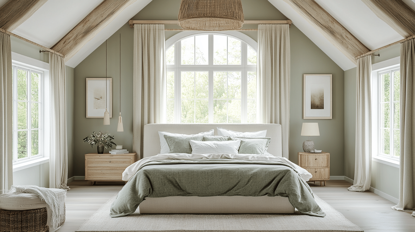 Enjoy a spacious and light-filled atmosphere with an airy sage green farmhouse bedroom. Affordable sage accents and minimalist décor cultivate a breezy, rustic feel. High ceilings and beige furnishings sourced from sales enhance the sense of openness and tranquility.