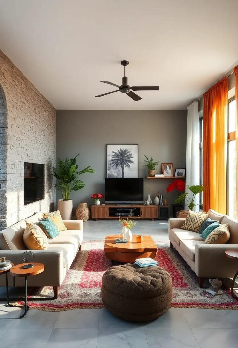 Add a splash of whimsy and comfort to your living room by incorporating floor cushions and poufs in lively, playful hues.These versatile pieces elevate your space by offering extra seating that’s both inviting and informal, perfect for lounging, chatting, or sparking spontaneous creativity. Choose cushions in rich jewel tones like turquoise, magenta, or mustard yellow, or go bold with eclectic patterns that draw the eye and celebrate the boho spirit. Their lightweight and portable nature mean you can easily rearrange your seating setup to suit any mood or occasion, blending effortlessly with your existing decor.