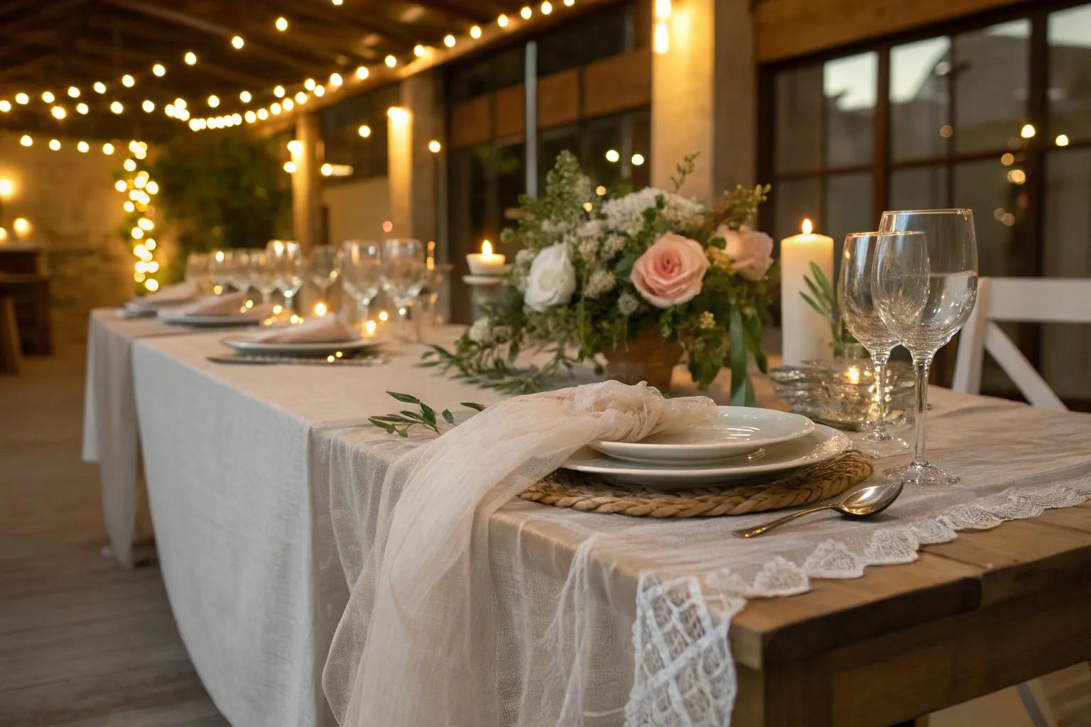 Bring a touch of nostalgia to your table by using a pastel-dyed cheesecloth runner paired with delicate antique teacups and saucers. This setup evokes the charm of a bygone era, ideal for intimate afternoon teas or bridal showers. Enhance the ambiance with a floral centerpiece and consider browsing for a pastel cheesecloth runner to complete the look.