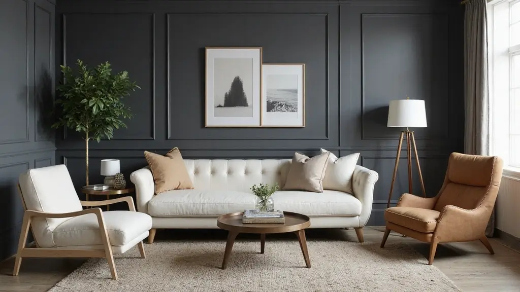 - Introduce light-toned sofas such as cream or ivory to contrast and warm up the dark gray backdrop.