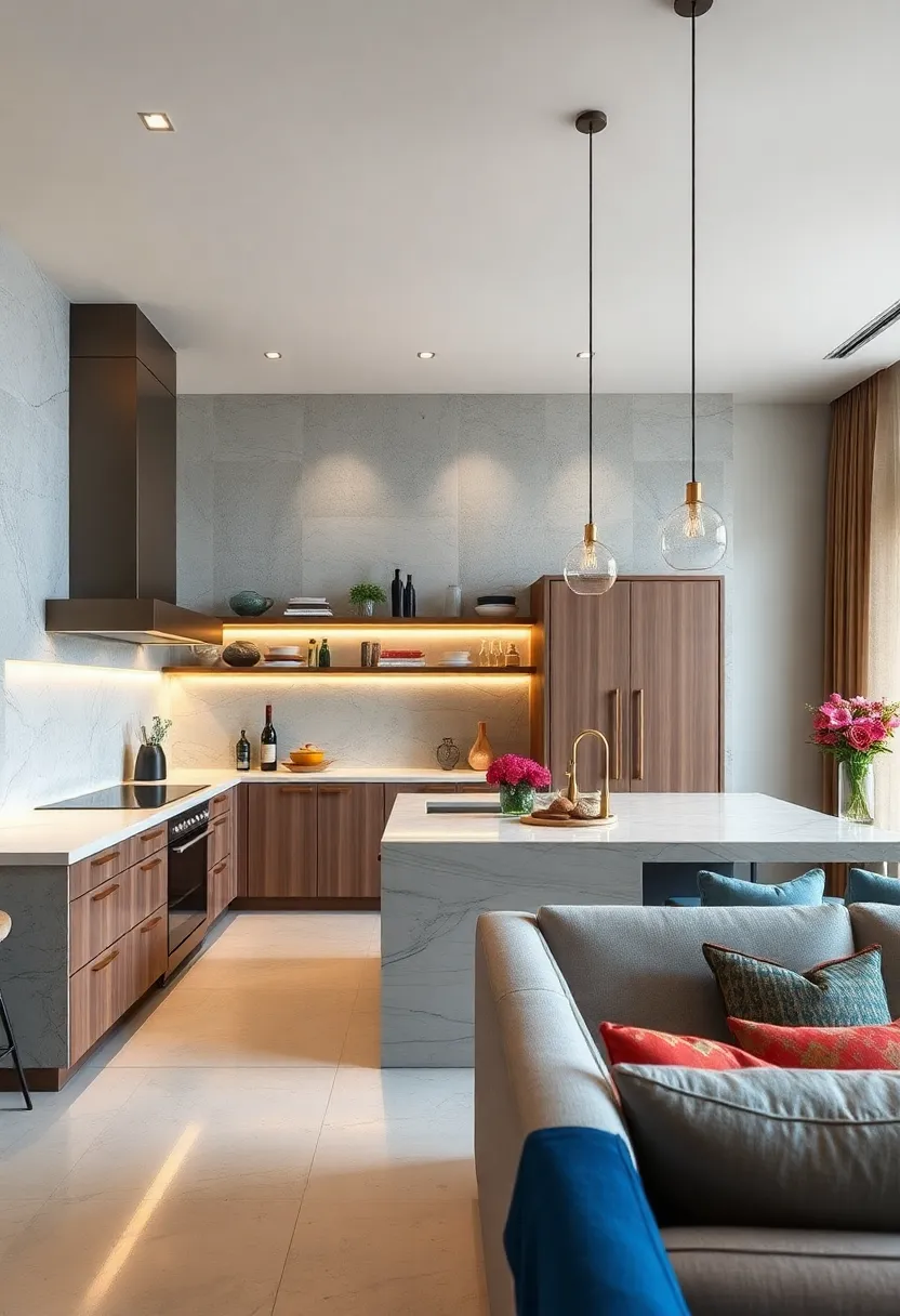 • Lighting plays: Pendant lights or under-cabinet LEDs to emphasize the contrast and add warmth.