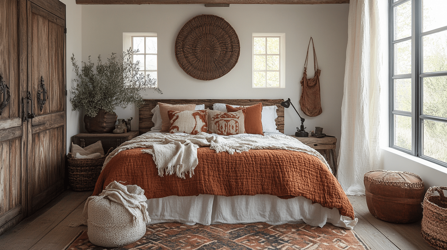 The Rustic Charm bedroom offers a warm and simple aesthetic with durable furniture and neutral hues easily sourced. Natural textiles and classic elements create a cozy, timeless atmosphere that feels like home without stretching your budget.