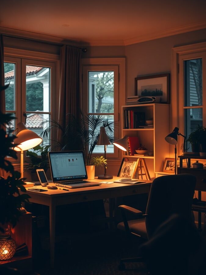 Observe how the combination of a desk lamp and natural light from the windows blends seamlessly. This soft illumination blurs the contours of furniture and greenery, enhancing the room’s welcoming vibe. Incorporating multiple light sources can significantly influence your comfort and focus during work.