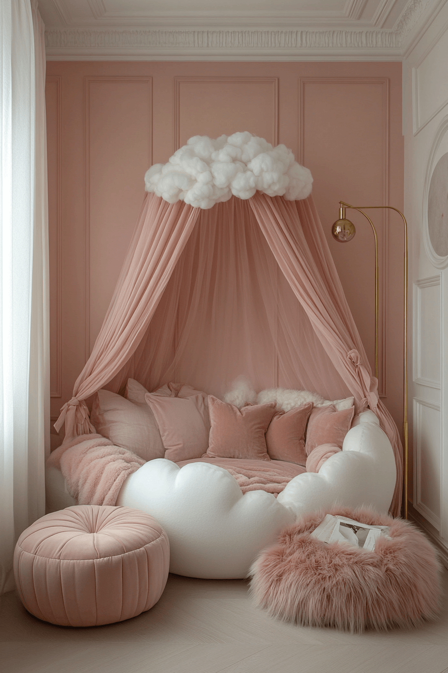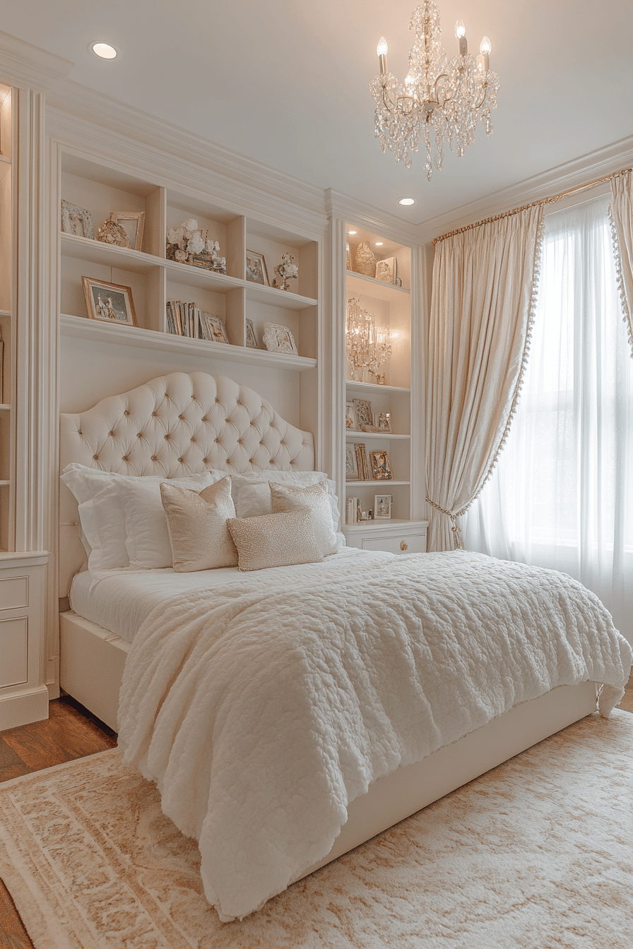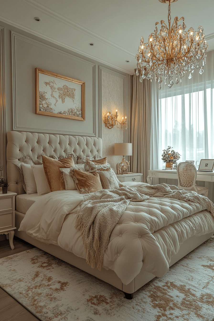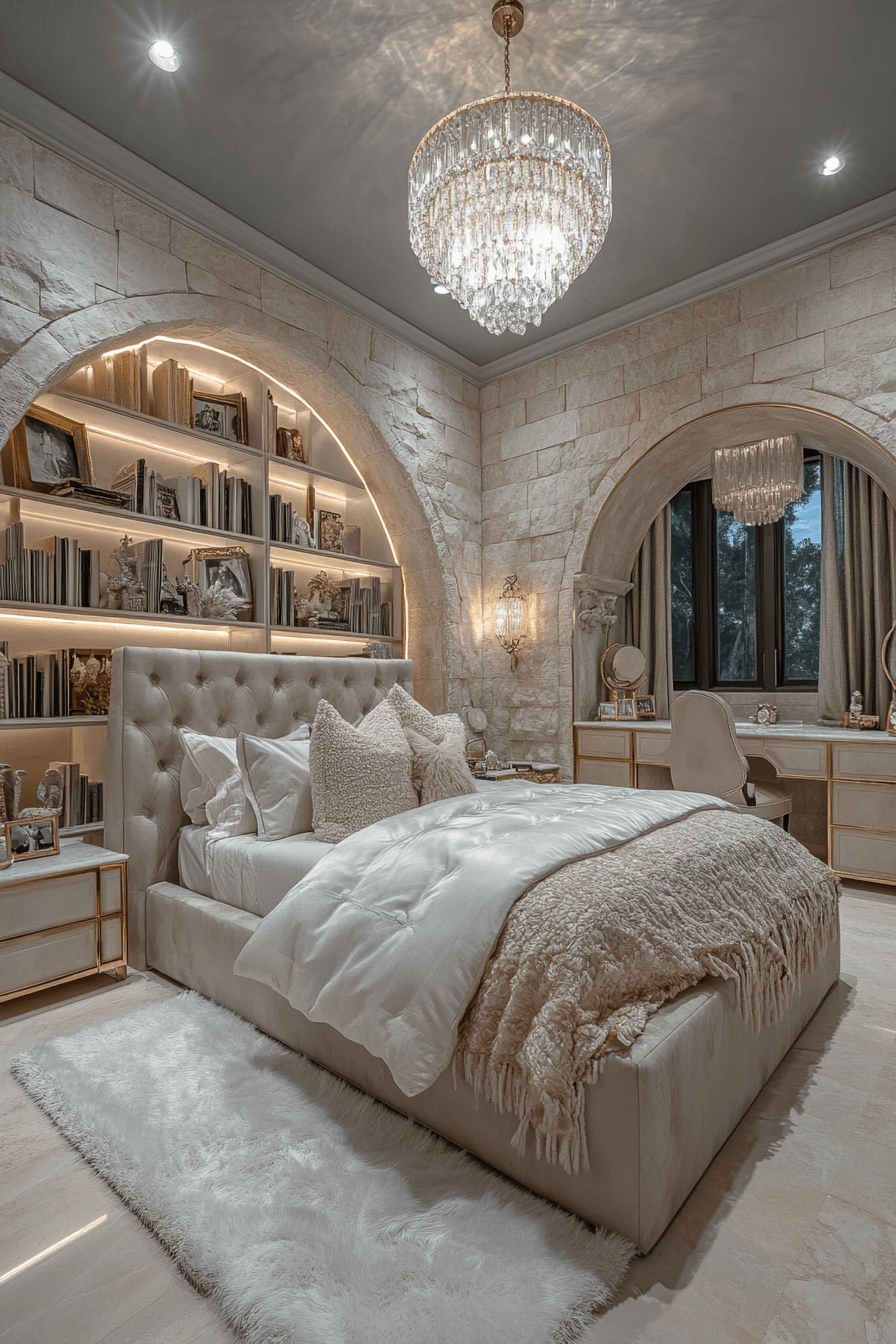 Soft furnishings, canopy beds, and thick rugs create a plush environment, while draped fabrics and crystal lamps add a royal flair. This room perfectly balances softness with sophistication.