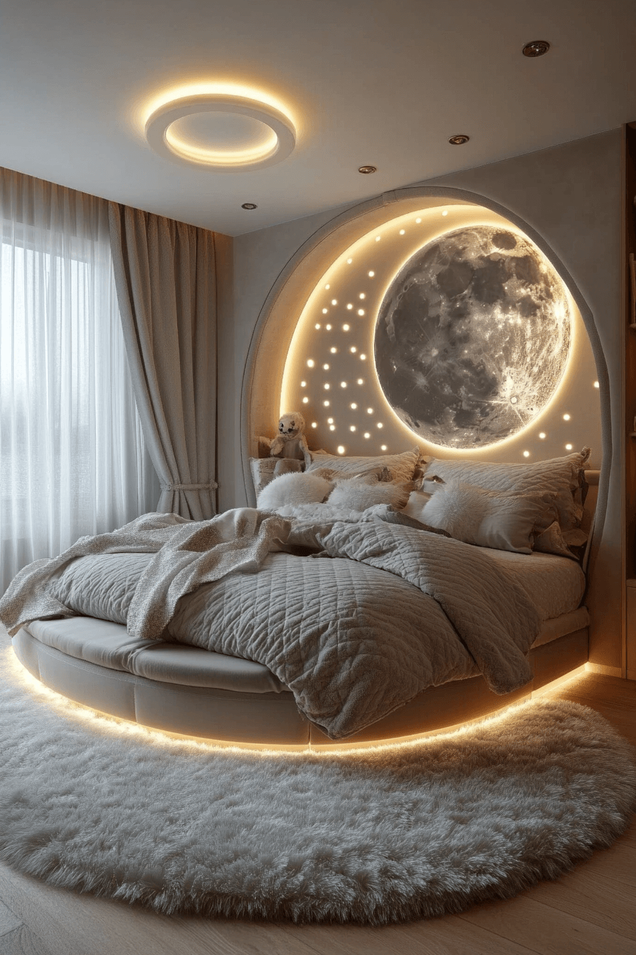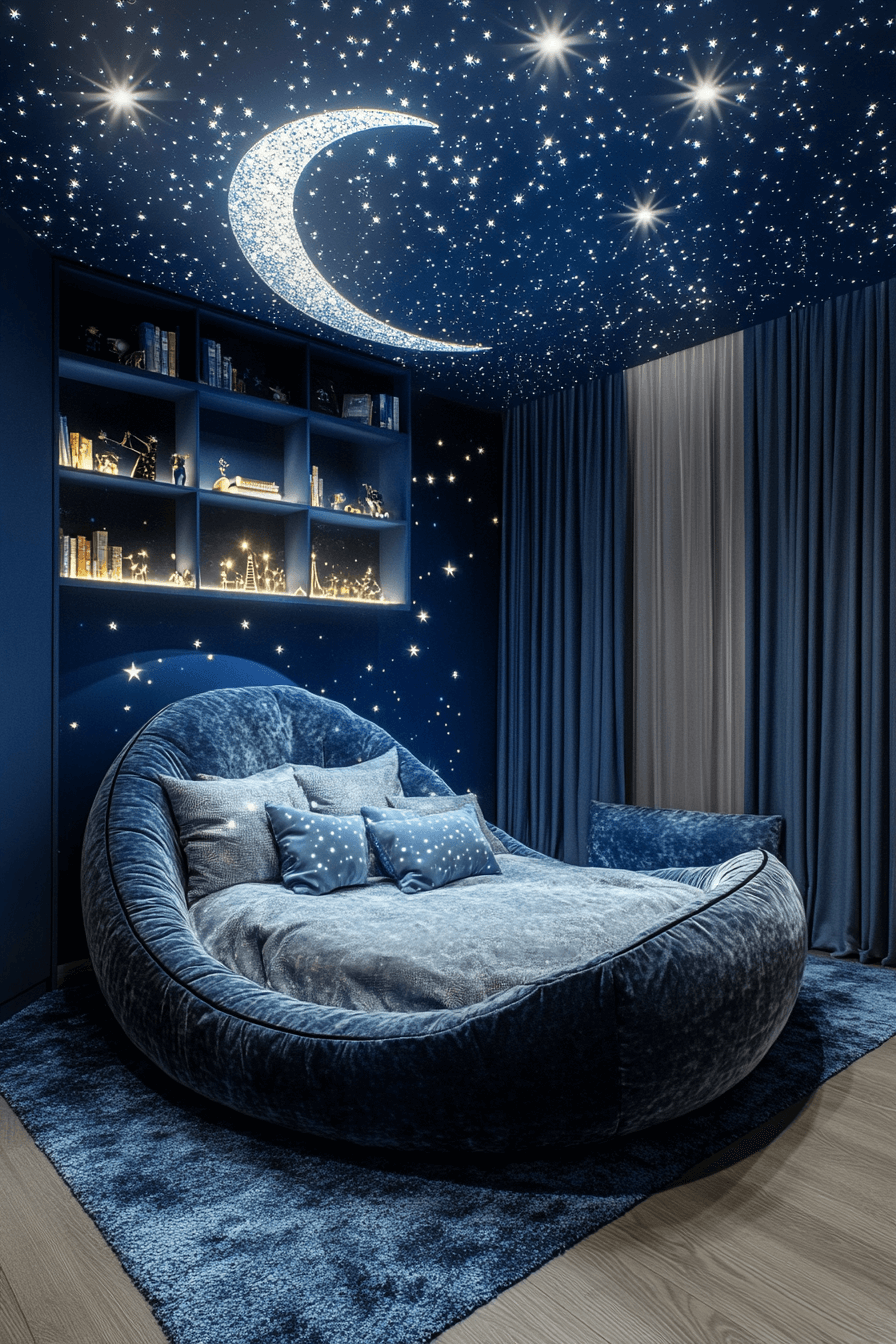 Immerse your child in a cosmic retreat with starry ceilings and moon-shaped lamps that bring the night sky indoors. Deep navy walls paired with silver details create a celestial atmosphere, while layered rugs and velvet cushions add warmth and texture. Dramatic lighting transforms bedtime into a magical journey, blending style with a touch of the universe.