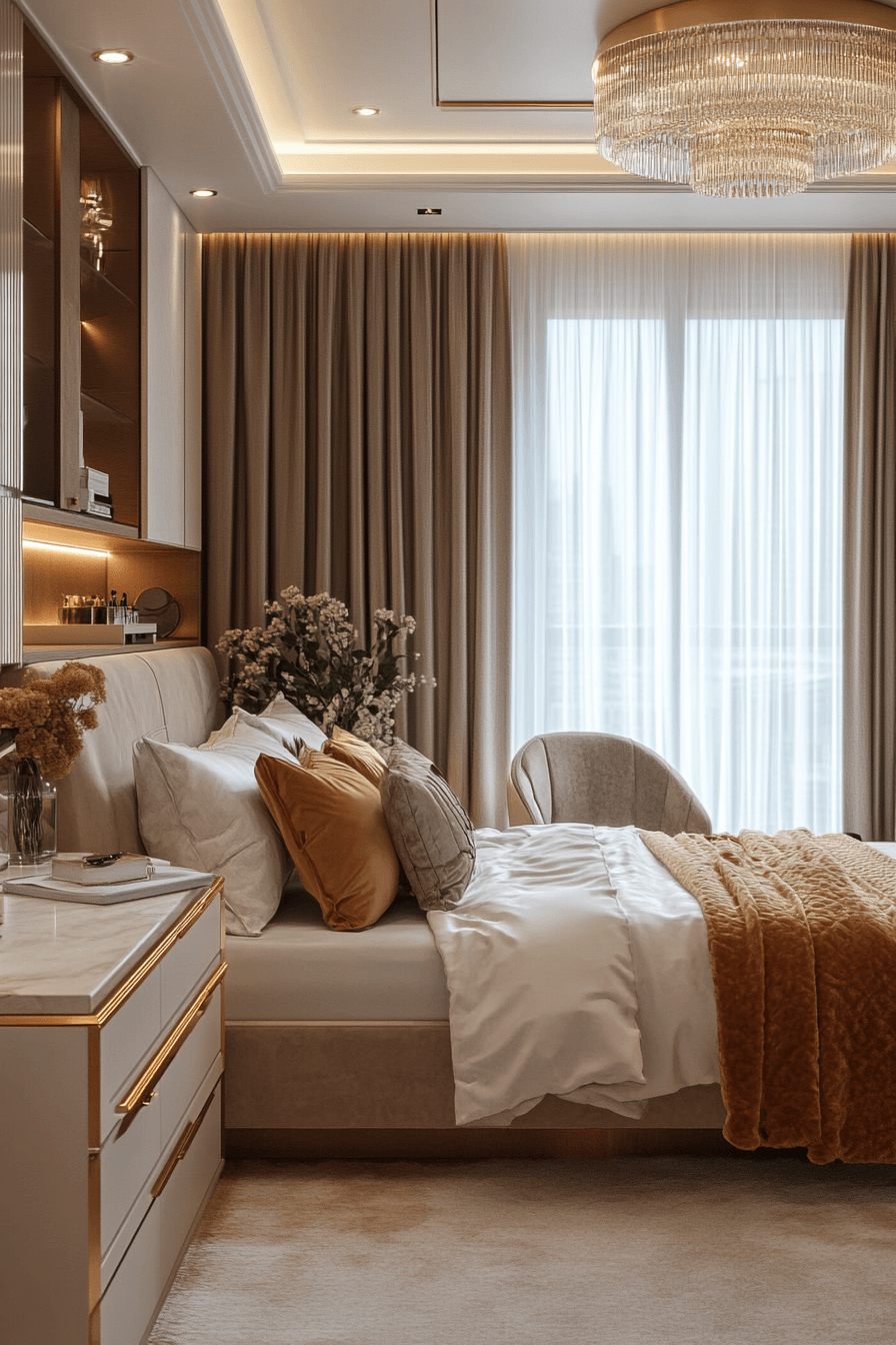 High-quality materials and subtle color palettes create a refined, timeless bedroom. Smooth cabinetry and soft wall panels maintain a polished look, while statement lighting adds a sophisticated finishing touch.