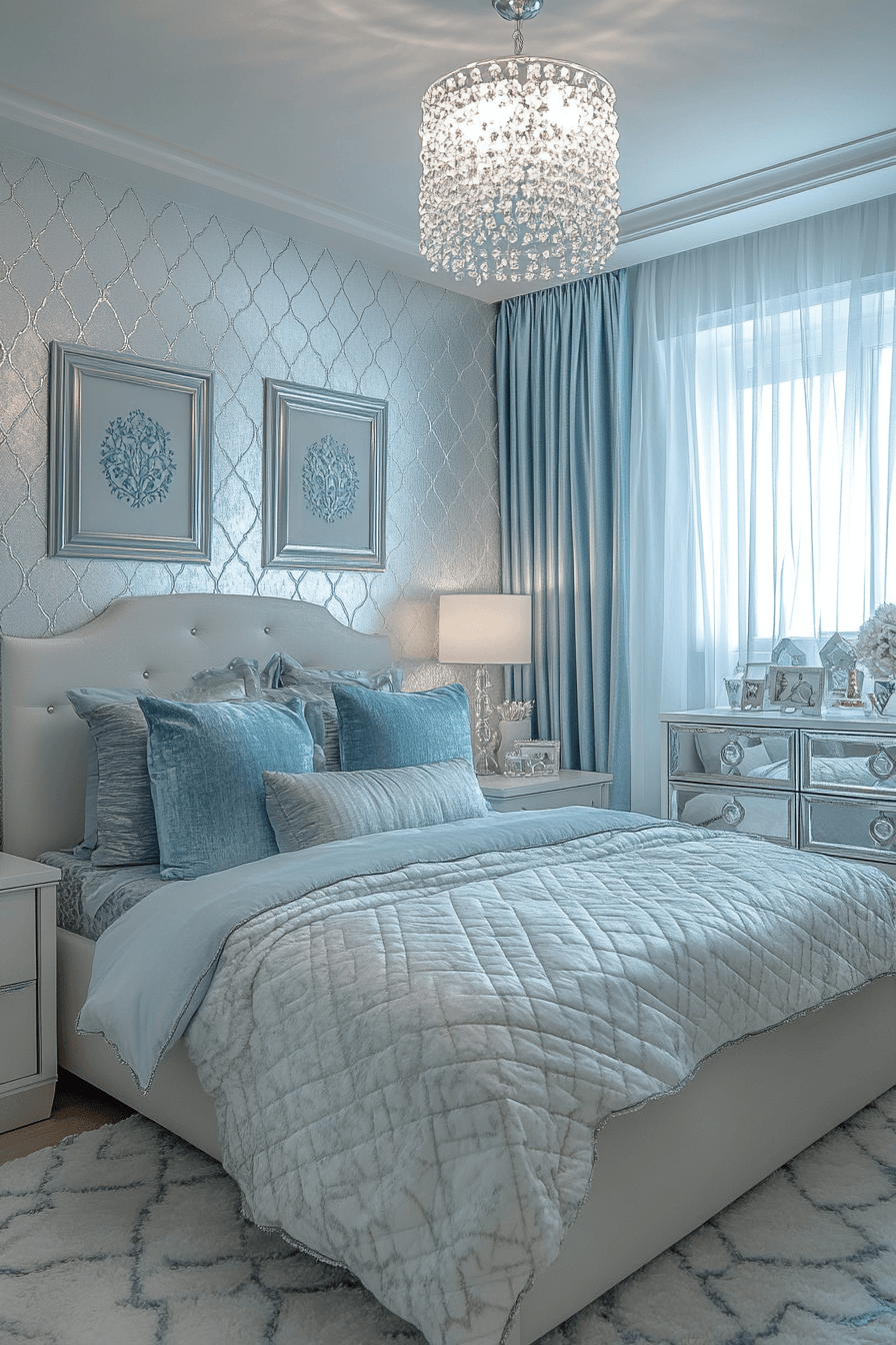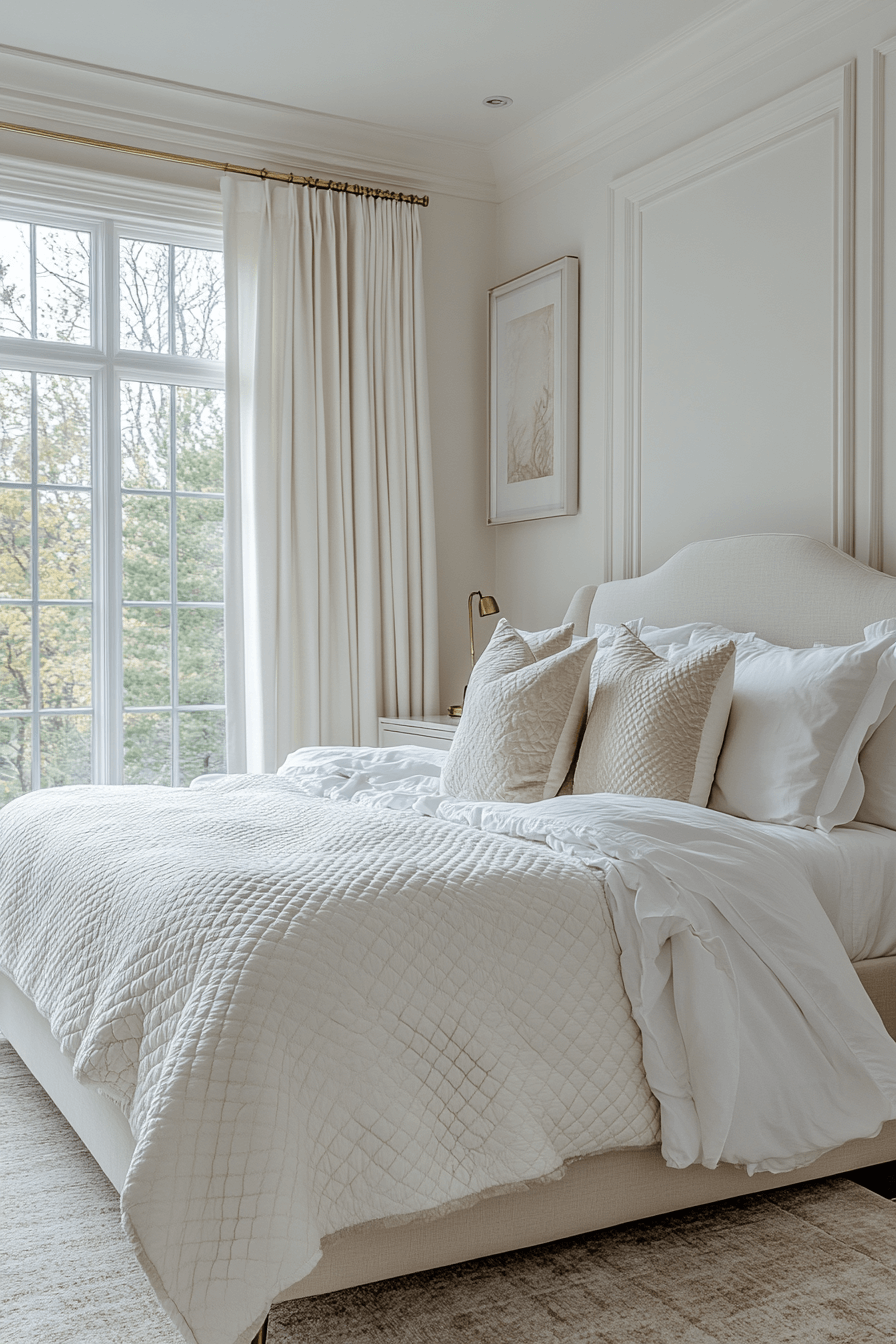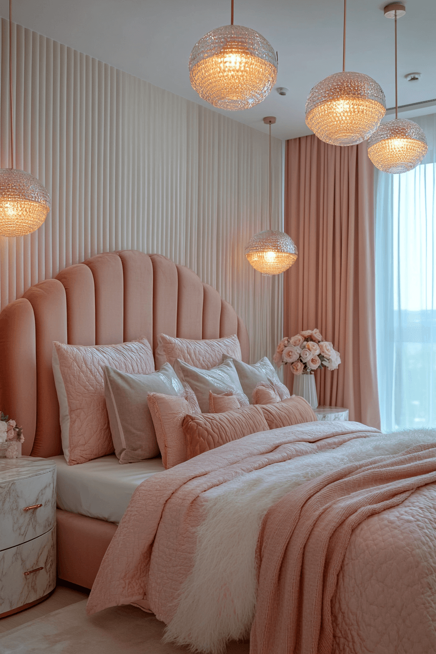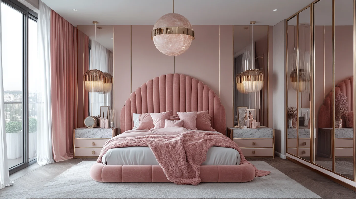 This design marries royal elegance with minimalist principles. Canopy beds, jewel-toned accents, and satin drapes create a subtle grandeur, complemented by crown molding and contemporary chandeliers. The result is a stately yet calming space that balances luxury with simplicity.