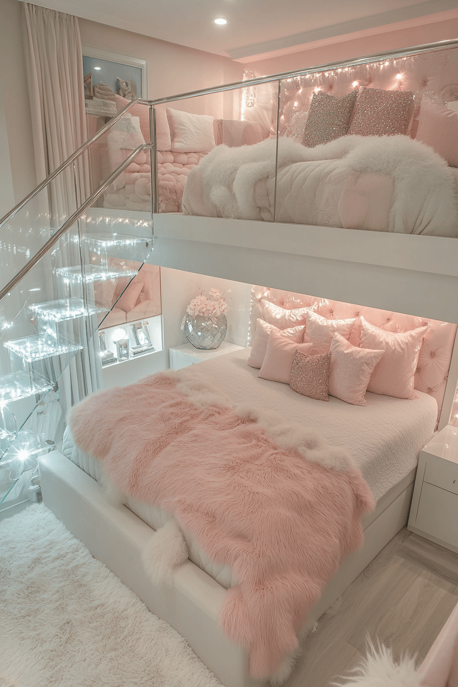 The Crystal Loft introduces a contemporary edge with acrylic furnishings, sparkling crystal lighting, and reflective surfaces. A loft bed optimizes floor space, while pale walls keep the room feeling open and bright. Plush rugs and faux fur accents add softness, creating a chic yet practical space.