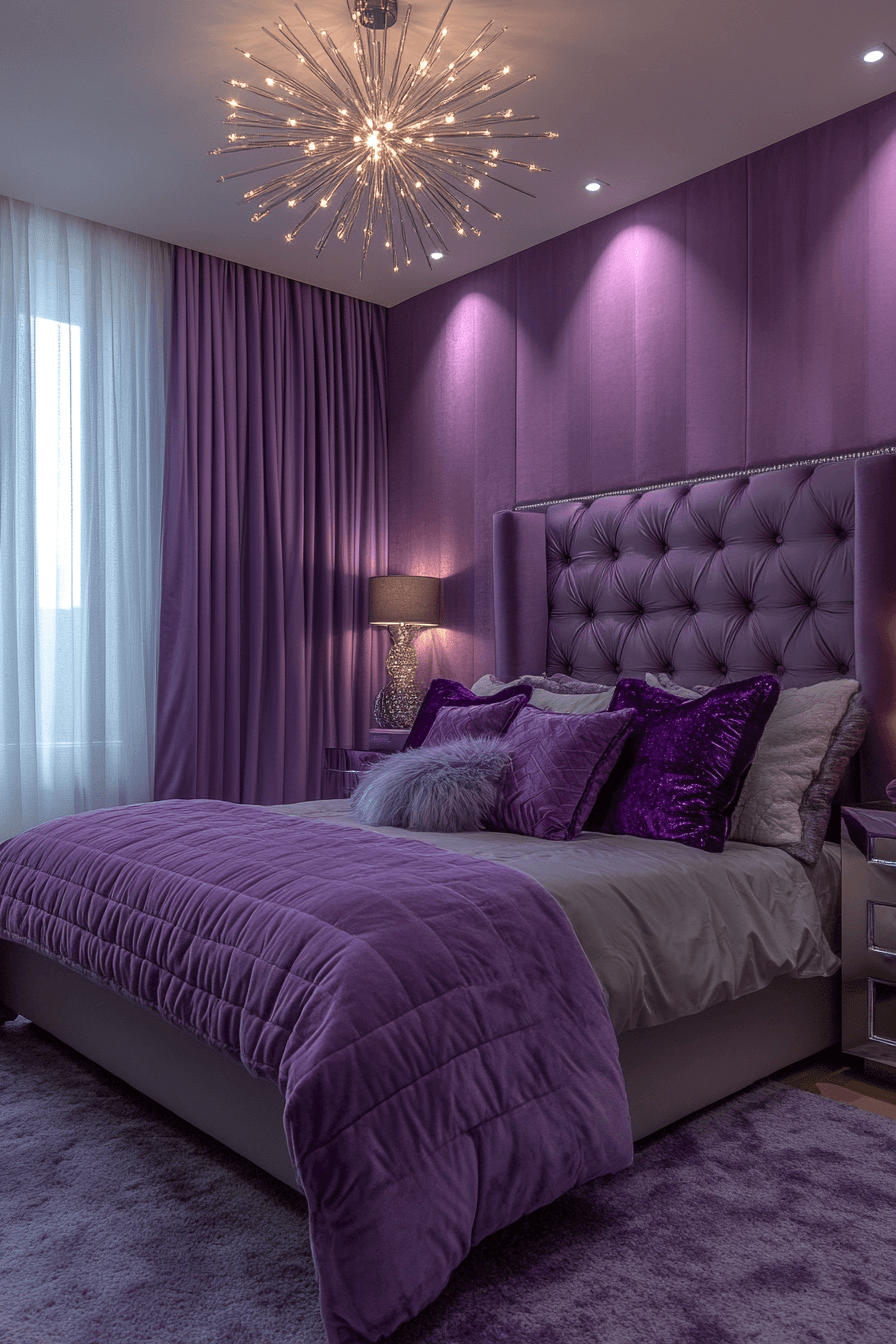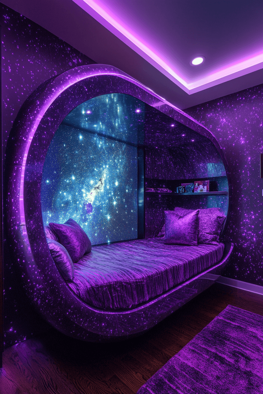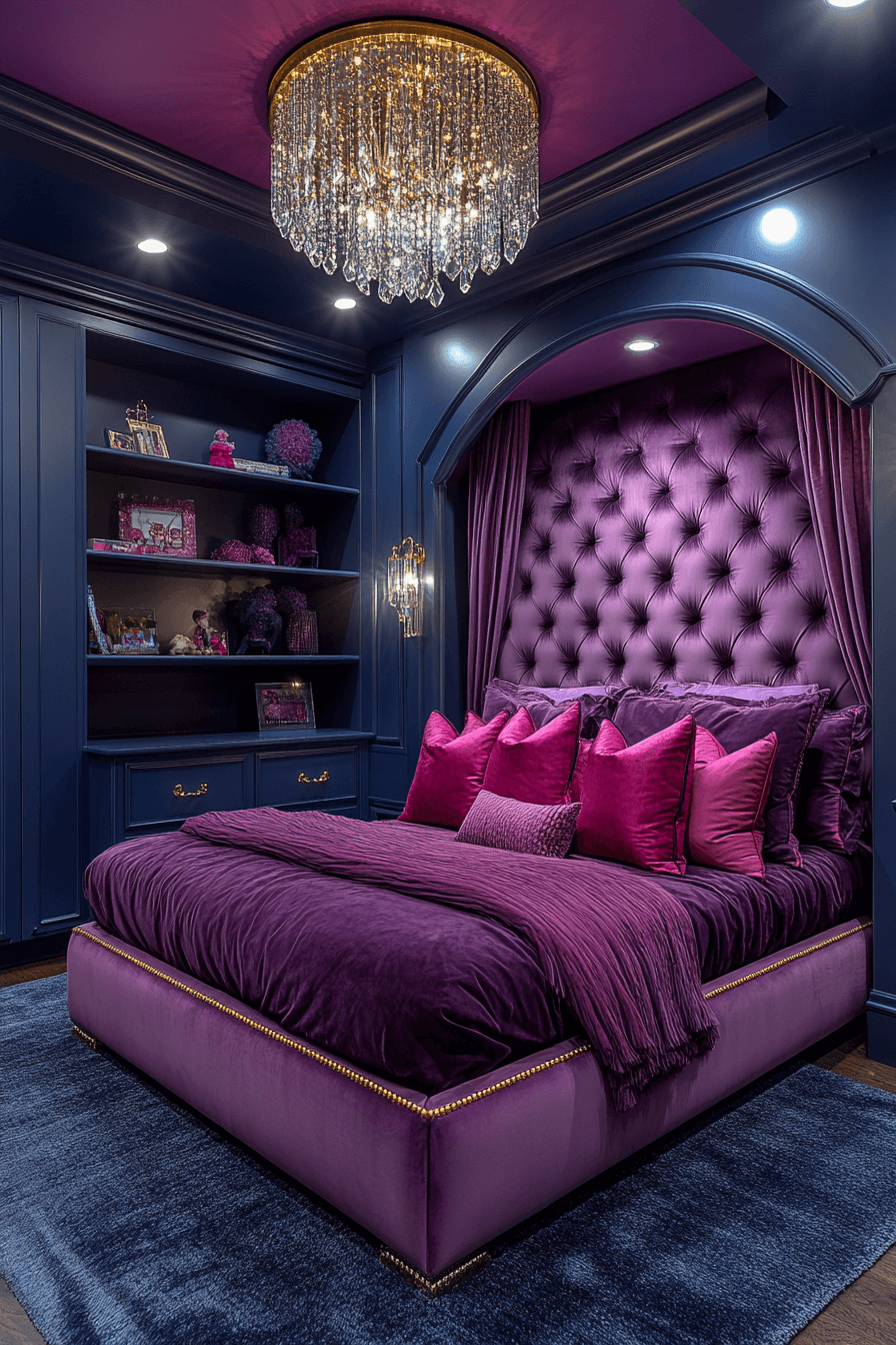 Rich purples, silvers, and deep blues create a moody yet inviting atmosphere. Layered lighting transitions the room effortlessly from energetic playtime to restful sleep, while velvet curtains and sleek furniture elevate the overall aesthetic.