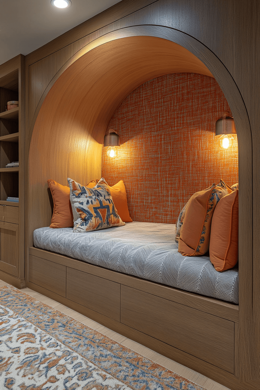 This intimate sleeping pod features designer wallpaper, accent lighting, and sleek furniture to create a private yet polished space. Built-in storage keeps the area organized and clutter-free.