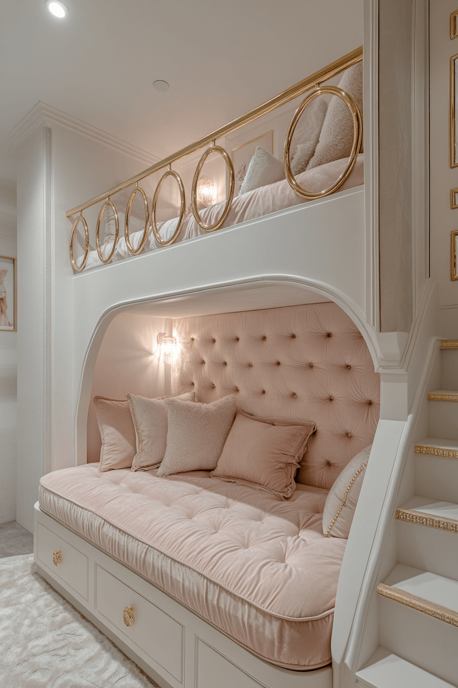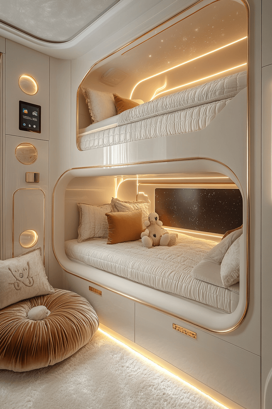 Perfect for siblings or stylish sleepovers, this bunk room features upholstered beds, gold accents, and curated color palettes. Built-in lighting personalizes each sleeping area, combining comfort with high-end design.