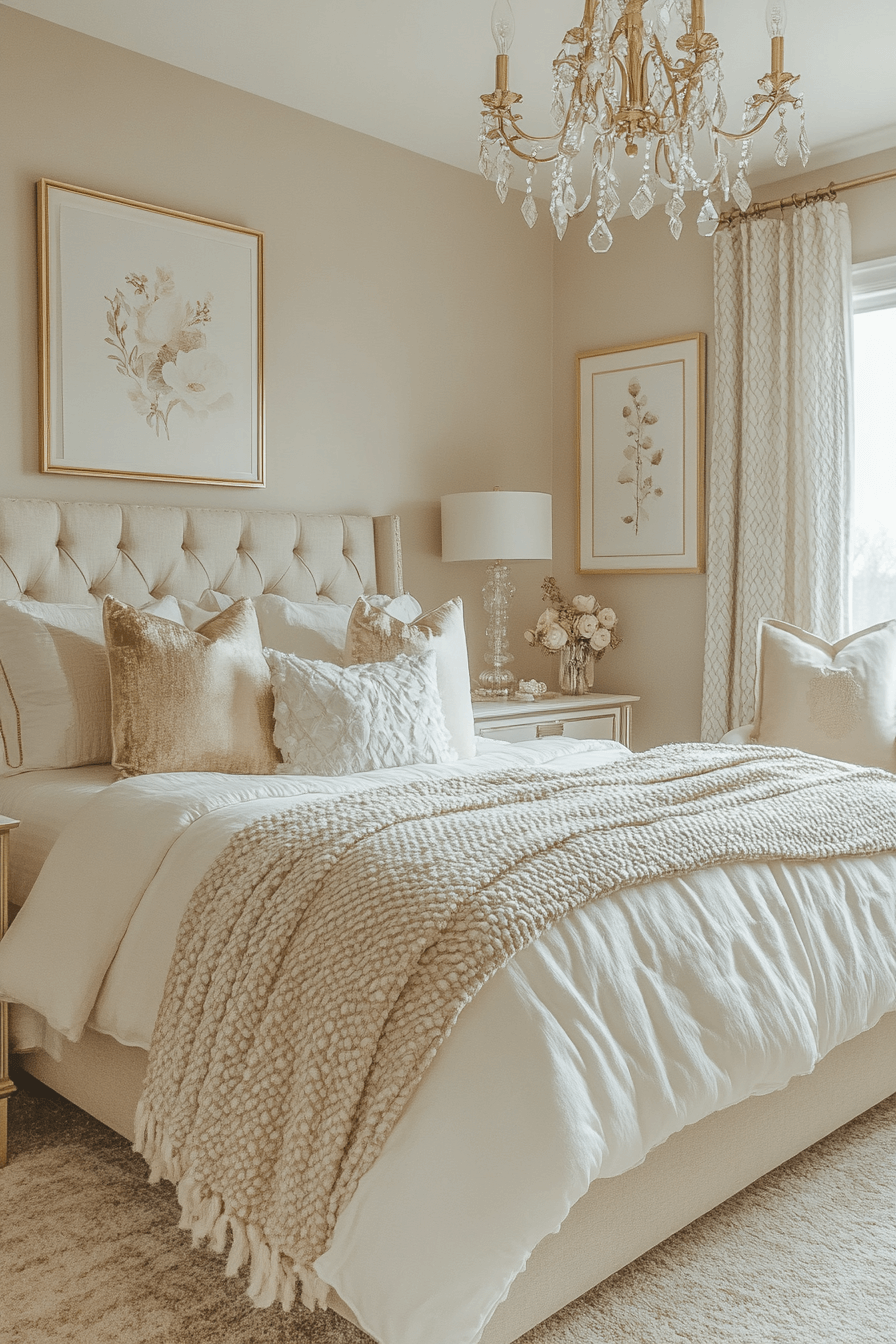 Soft neutral backgrounds paired with delicate gold accents create an understated yet luxurious atmosphere. Velvet furnishings and gentle lighting add warmth, while minimal clutter keeps the space polished and inviting.