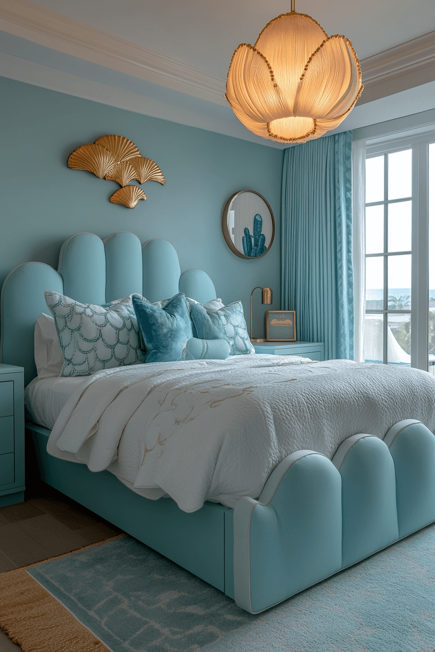 Inspired by the ocean, this bedroom features seafoam greens, navy blues, and pearly whites. Wave motifs and sleek white furniture evoke a fresh, elegant coastal vibe, complemented by a cozy nook that balances playfulness with style.