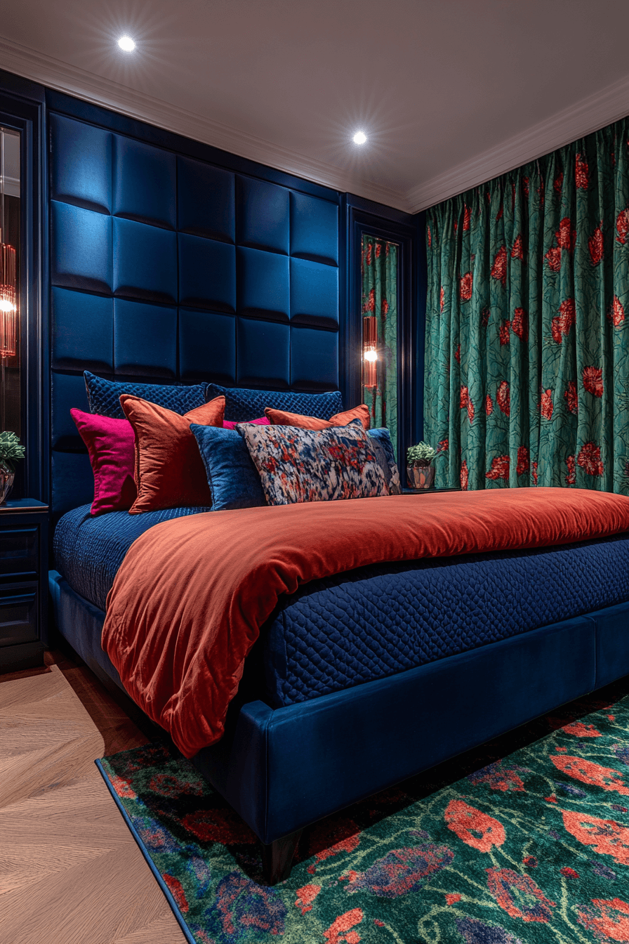 Bold jewel tones combined with gold accents and LED lighting create a lively yet sophisticated space. This design energizes the room while maintaining an upscale feel.